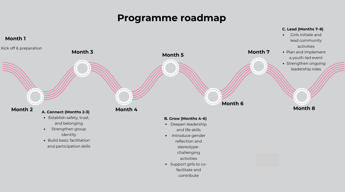 Leadership & community change: Girls transition from participation to leadership, becoming role models and contributing to more inclusive, youth-friendly communities.